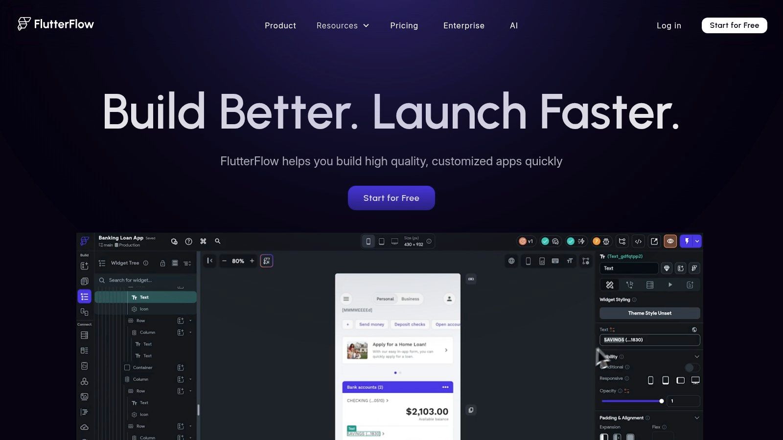 FlutterFlow is a low-code app builder without coding that accelerates development on the Flutter framework, enabling you to create beautiful, natively compiled applications for mobile, web, and desktop from a single visual interface. It is uniquely positioned for teams who want the speed of visual development without sacrificing ownership of the source code. This makes it a powerful option for startups who need to move quickly but want to avoid the hard limits of traditional no-code platforms.