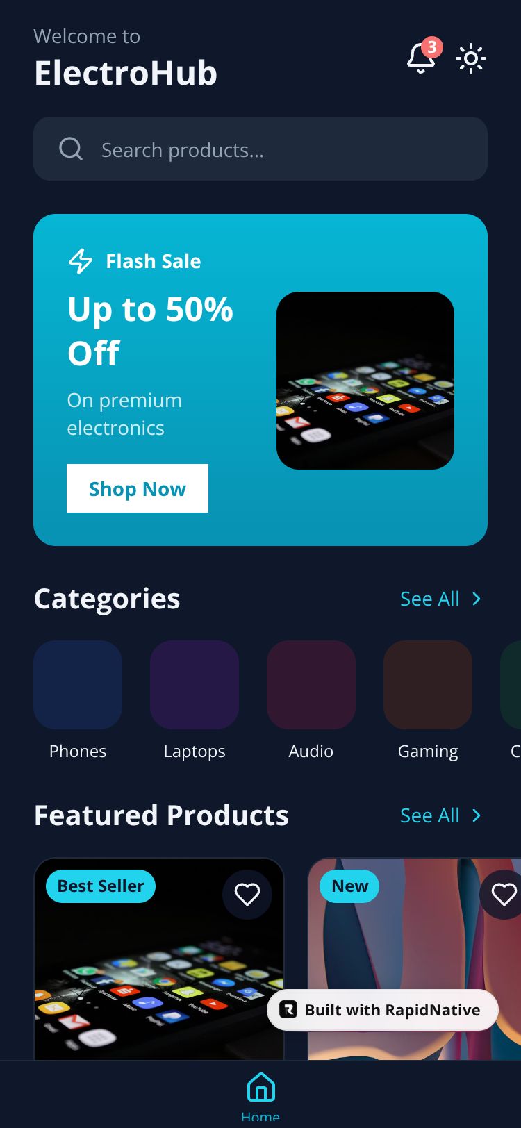 A modern e-commerce app for electronics with product browsing, search, cart, and user profiles. Discover the latest tech gadgets and devices.