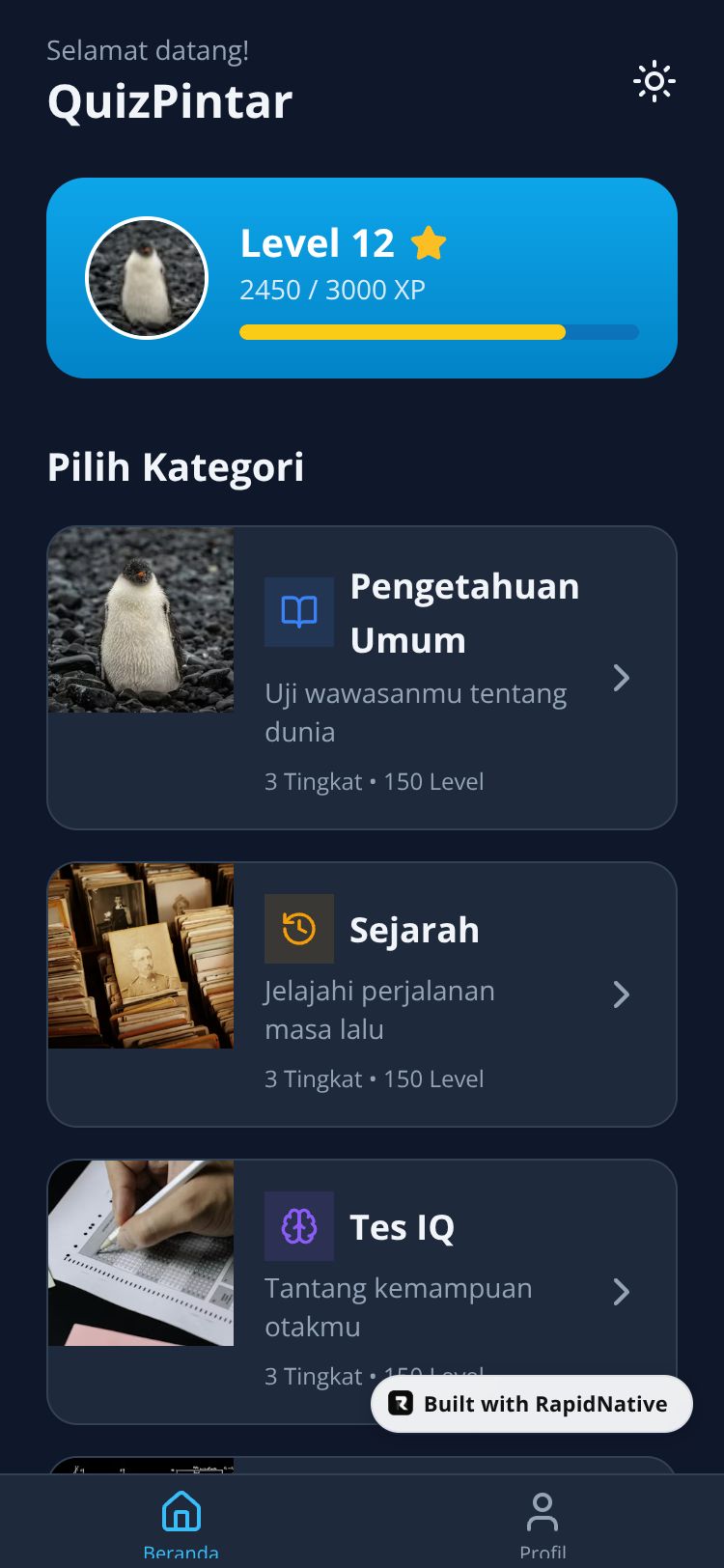 Aplikasi kuis edukatif dengan kategori pengetahuan umum, sejarah, tes IQ, dan matematika. Sistem level dengan XP dan pesan motivasi.