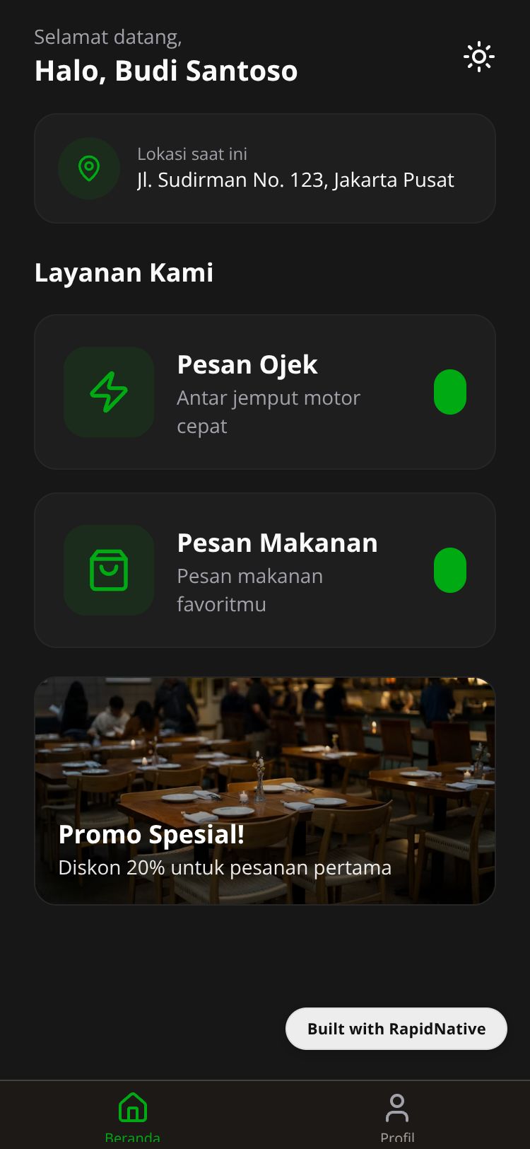 On-demand service platform for motorcycle rides and food delivery. Connect users with drivers for ojek and food orders.