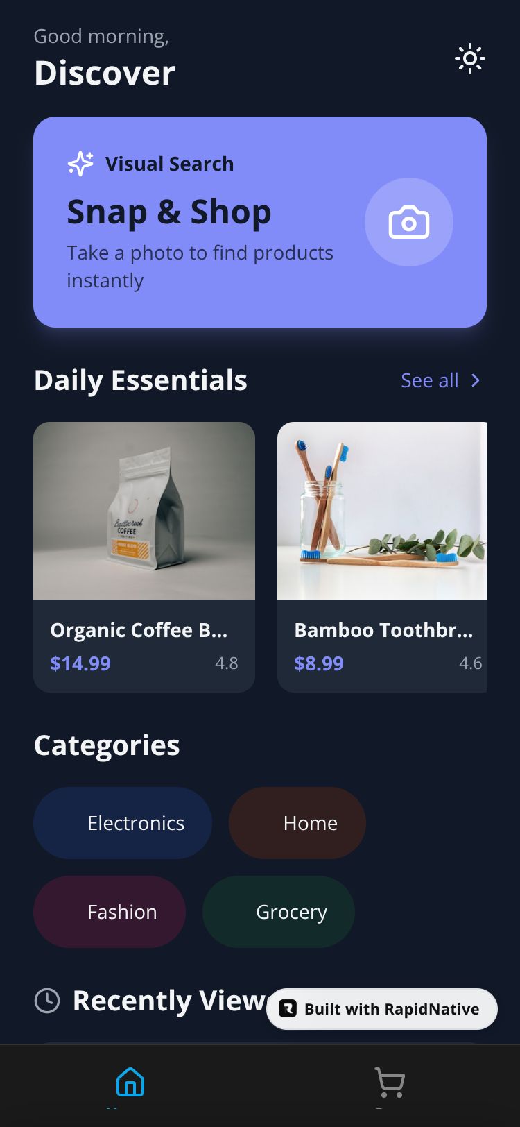 A minimalist shopping experience focused on visual search and daily essentials with a clean, modern interface.