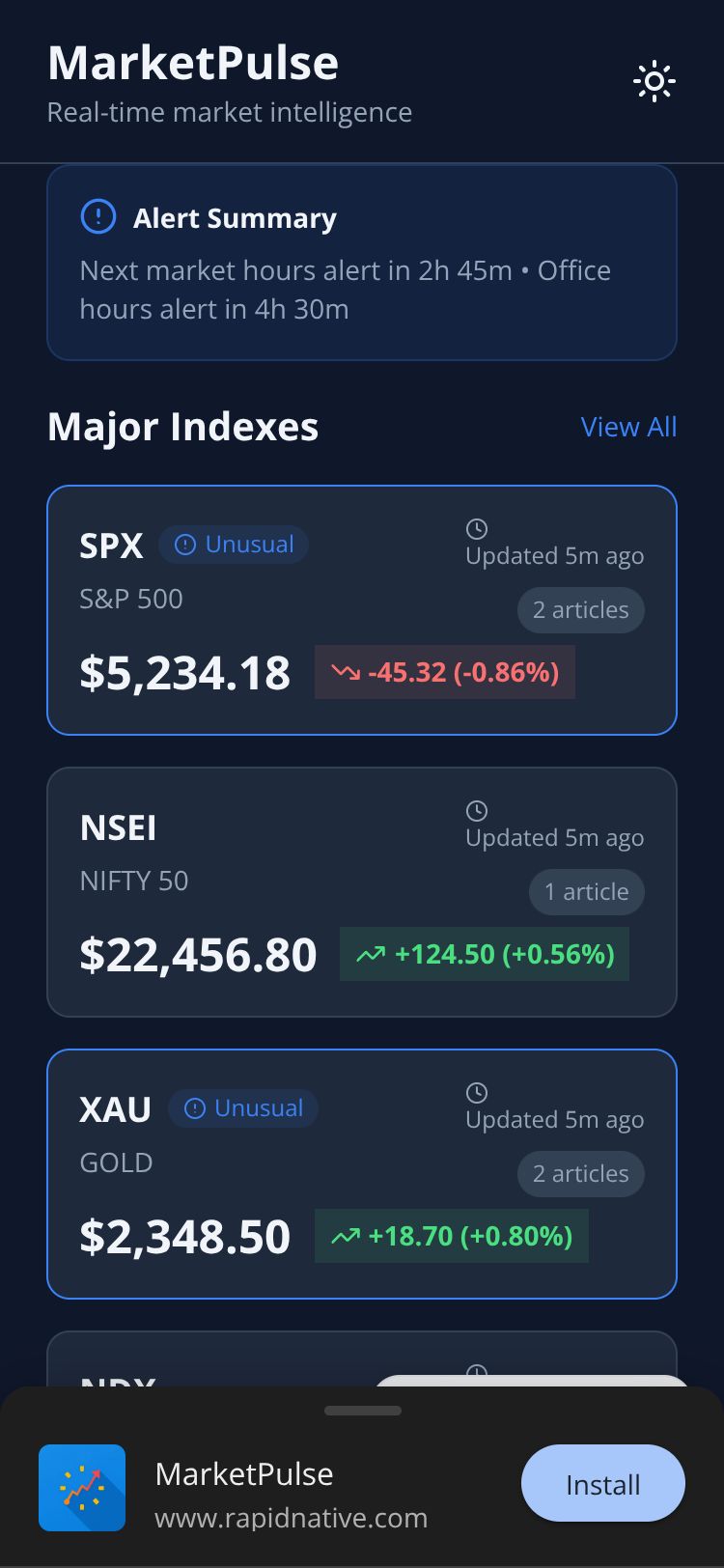 Track major market indexes (US, India, Gold) and custom stocks with real-time alerts and news tagged to unusual movements.