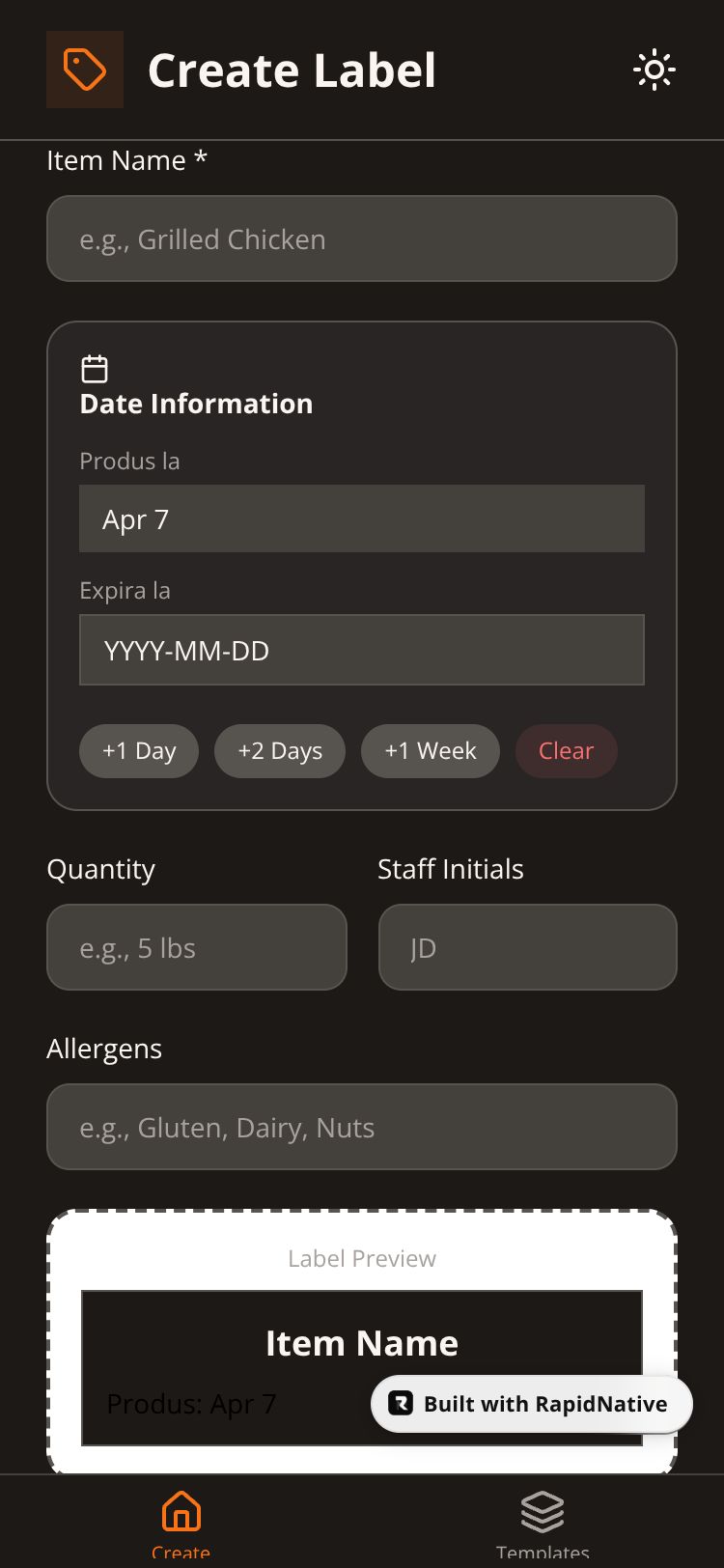 Browse this public project and clone it to start building your own React Native KitchenLabel Pro app.