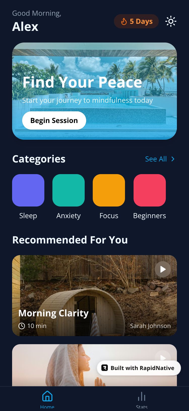 A serene meditation app offering guided sessions for sleep, focus, and anxiety relief. Track your mindfulness journey with daily streaks and progress analytics.