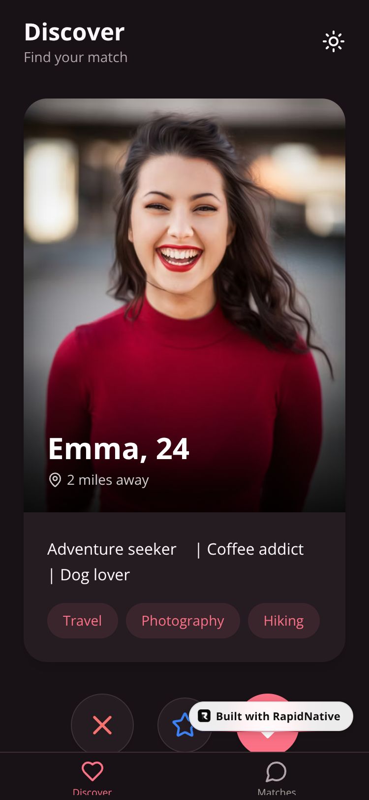 A modern dating app to find meaningful connections with swipe-based discovery and real-time messaging.