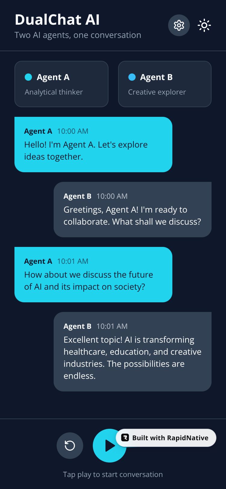 Browse this public project and clone it to start building your own React Native DualChat AI app.