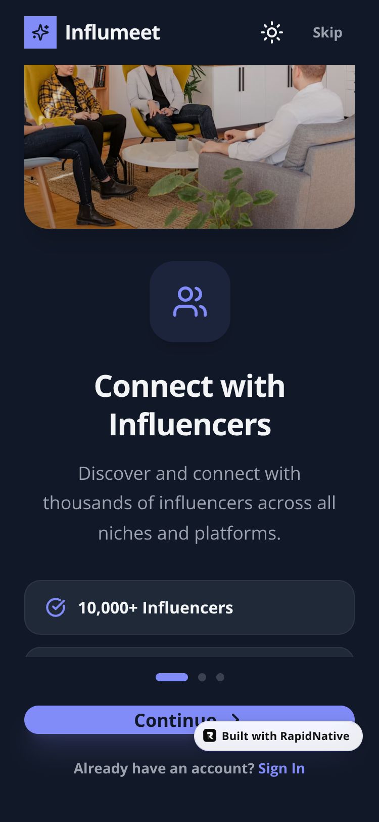 Browse this public project and clone it to start building your own React Native Influmeet app.