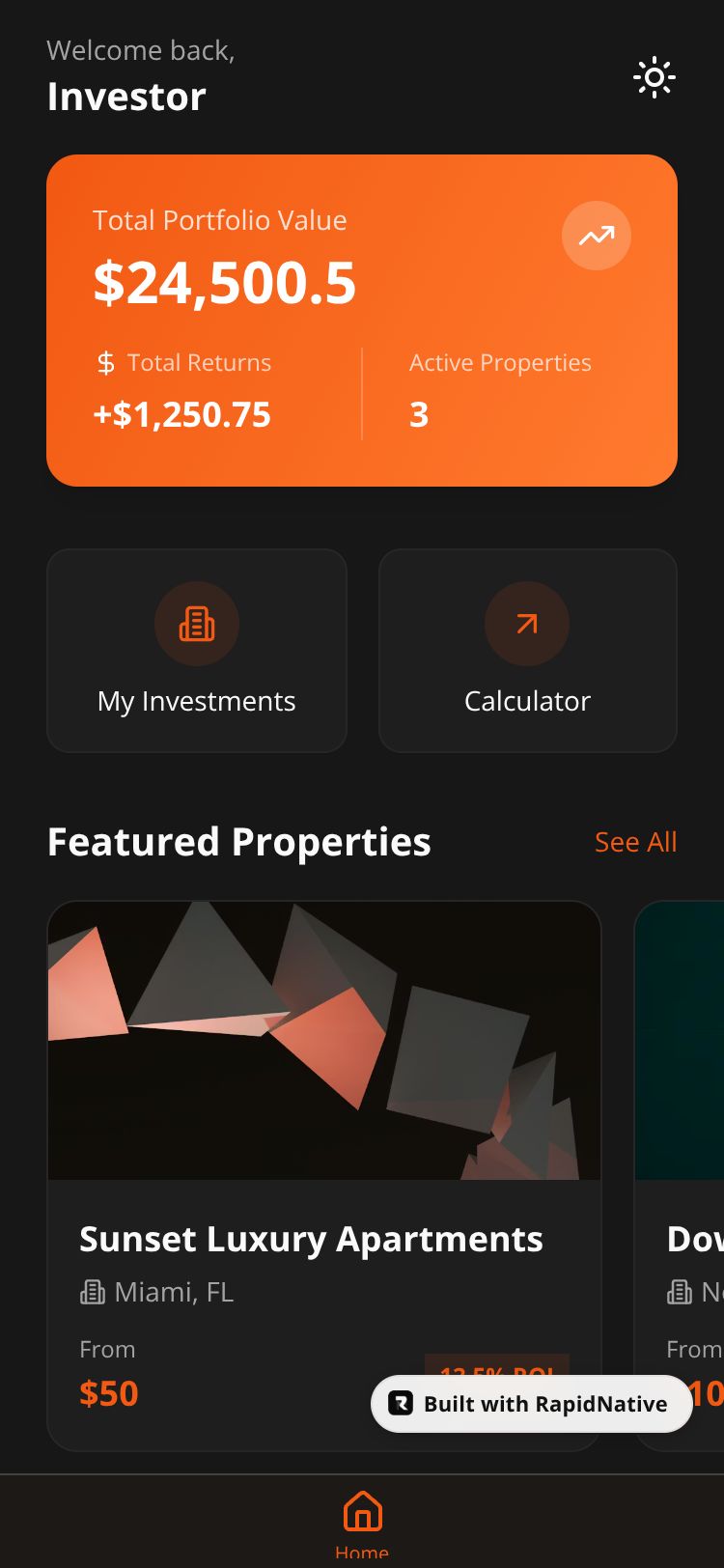 A fractional real estate investment platform allowing users to browse properties, invest small amounts, and track returns.