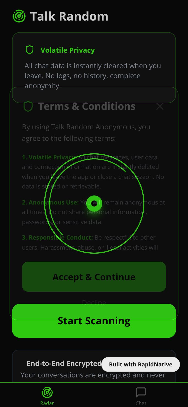 Anonymous random chat app with radar scanning feature and volatile privacy. Connect instantly with random users while maintaining complete privacy.