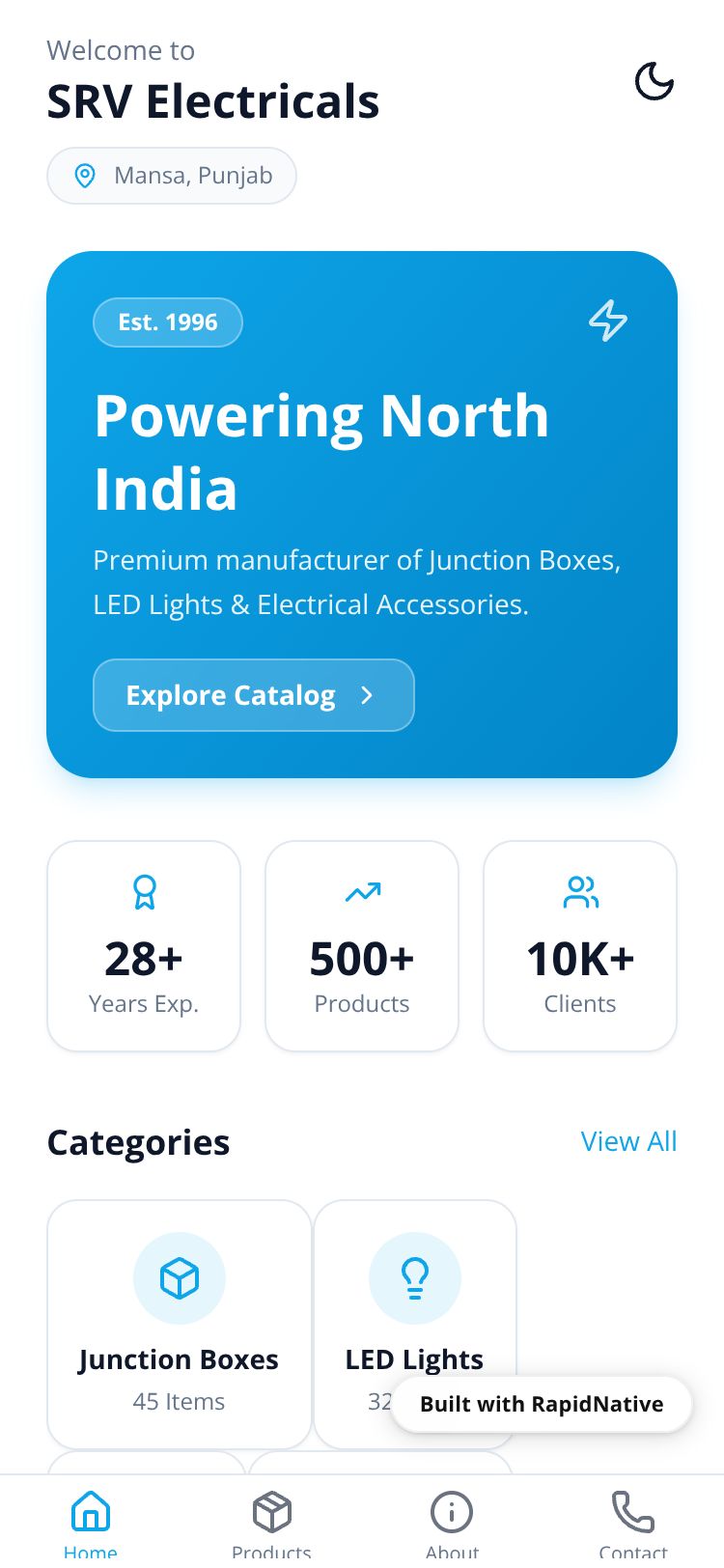 Official mobile app for SRV Electricals - Leading manufacturer of LED lights, junction boxes, and electrical accessories in Punjab.