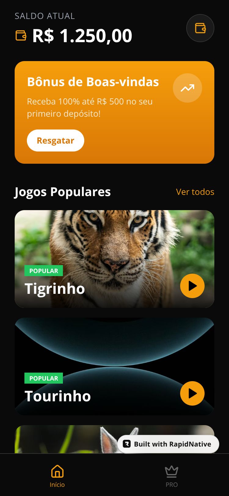 Aplicativo de apostas e cassino online com jogos populares como Tigrinho, Tourinho e Coelhinho, além de uma seção VIP PRO.