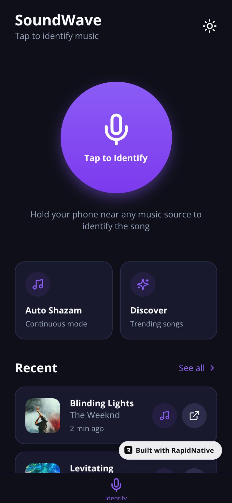 Instantly identify music playing around you. Discover songs, artists, lyrics, and concerts. Save favorites and open in Spotify or Apple Music.