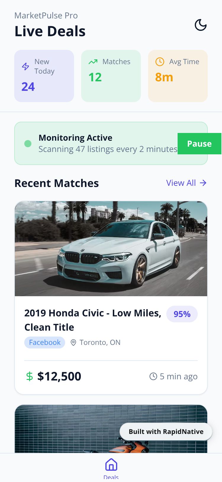 Real-time marketplace monitor for high-volume flippers. Get instant alerts on cars, vending machines, and deals across Facebook Marketplace and Kijiji.