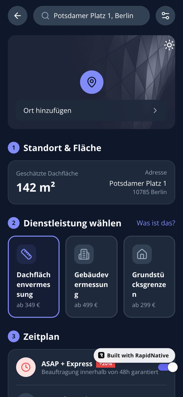 Professionelle Vermessungsdienstleistungen App mit Buchungsflow, Kartenansicht und Zahlungsabwicklung für Immobilienvermessungen.