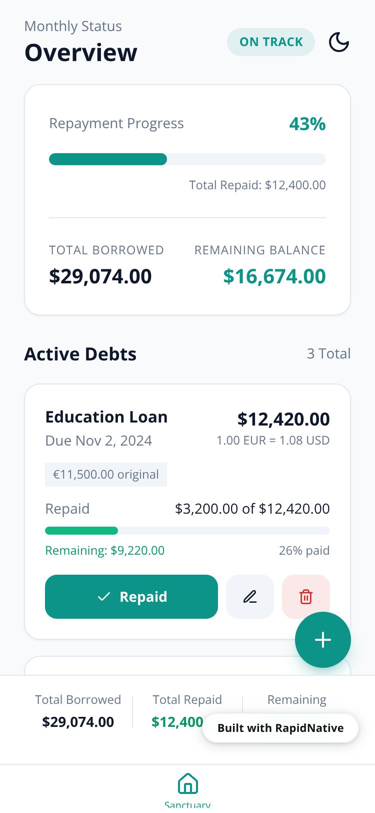 A minimal debt tracker for personal loans with automatic historical exchange rate conversion to USD. Track borrowed amounts, repayments, and remaining balances with a clean, intuitive interface.