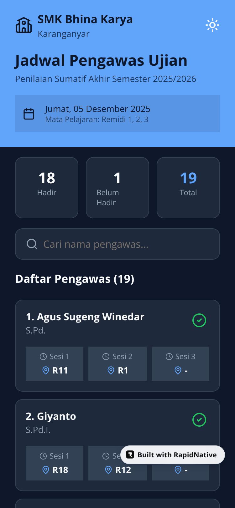 Aplikasi jadwal pengawas ujian semester untuk SMK Bhina Karya Karanganyar. Menampilkan daftar pengawas, ruangan, dan sesi ujian secara real-time dengan fitur pencarian dan absensi.