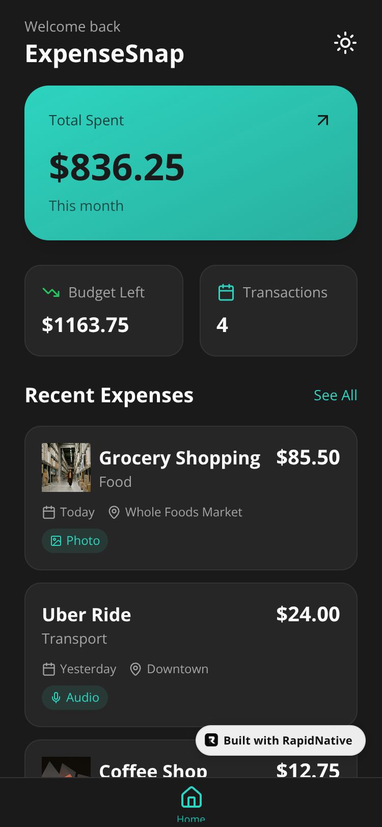 React Native ExpenseSnap App Preview