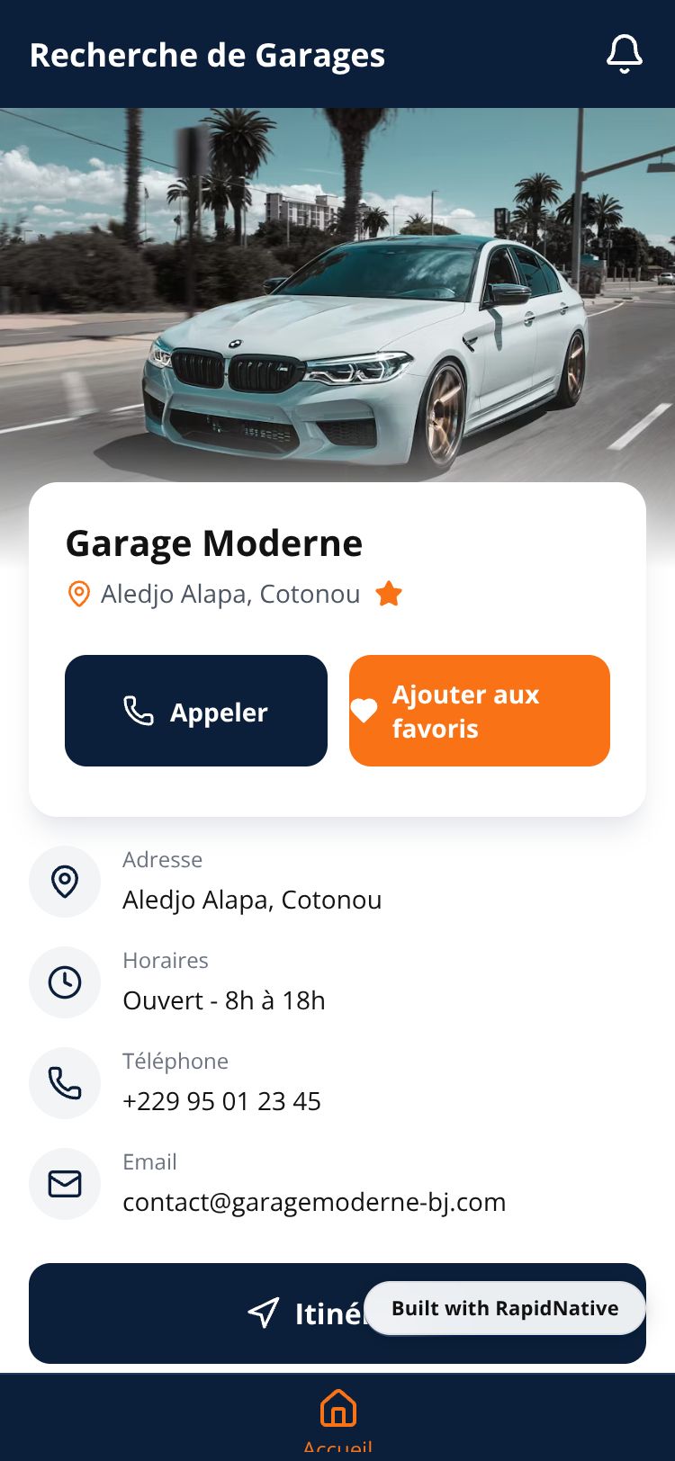 Application mobile de recherche de garages au Bénin. Trouvez, ajoutez et gérez vos garages favoris avec appels directs et itinéraires.