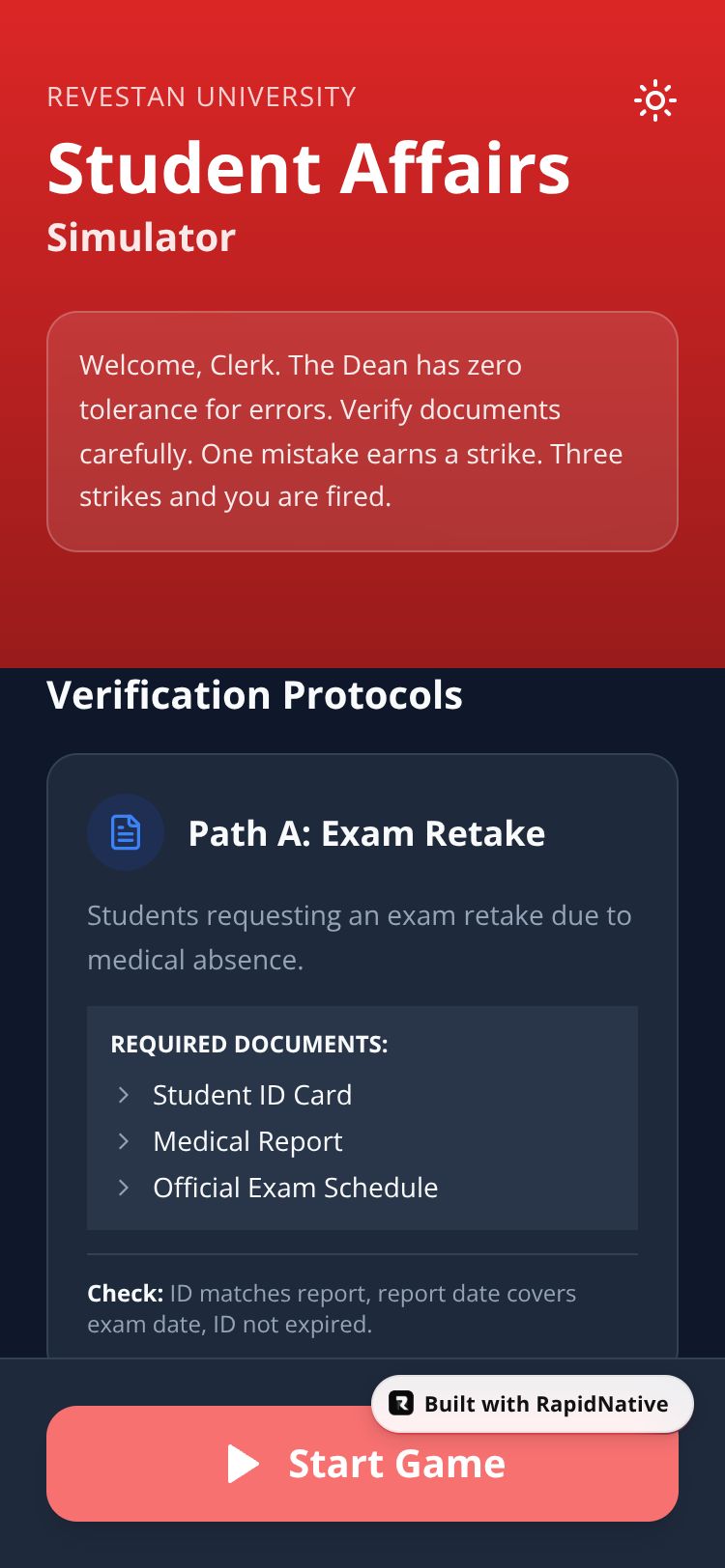 A high-stakes bureaucracy simulator where you verify complex student document chains at Revestan University. One mistake earns a strike from the Dean. 3 strikes = Game Over!
