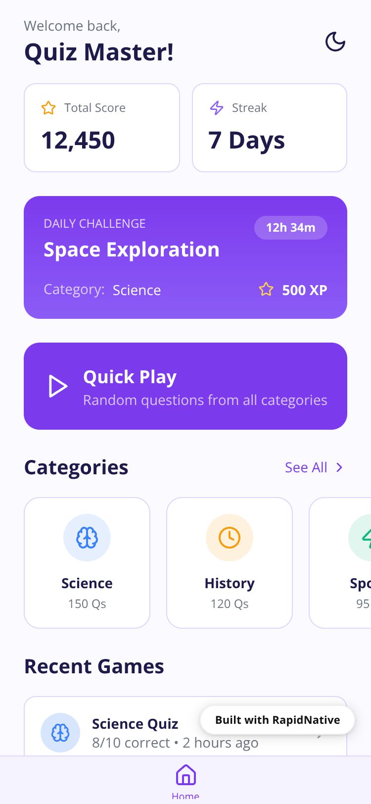 A fun and challenging trivia game with multiple categories, daily challenges, and score tracking to test your knowledge.