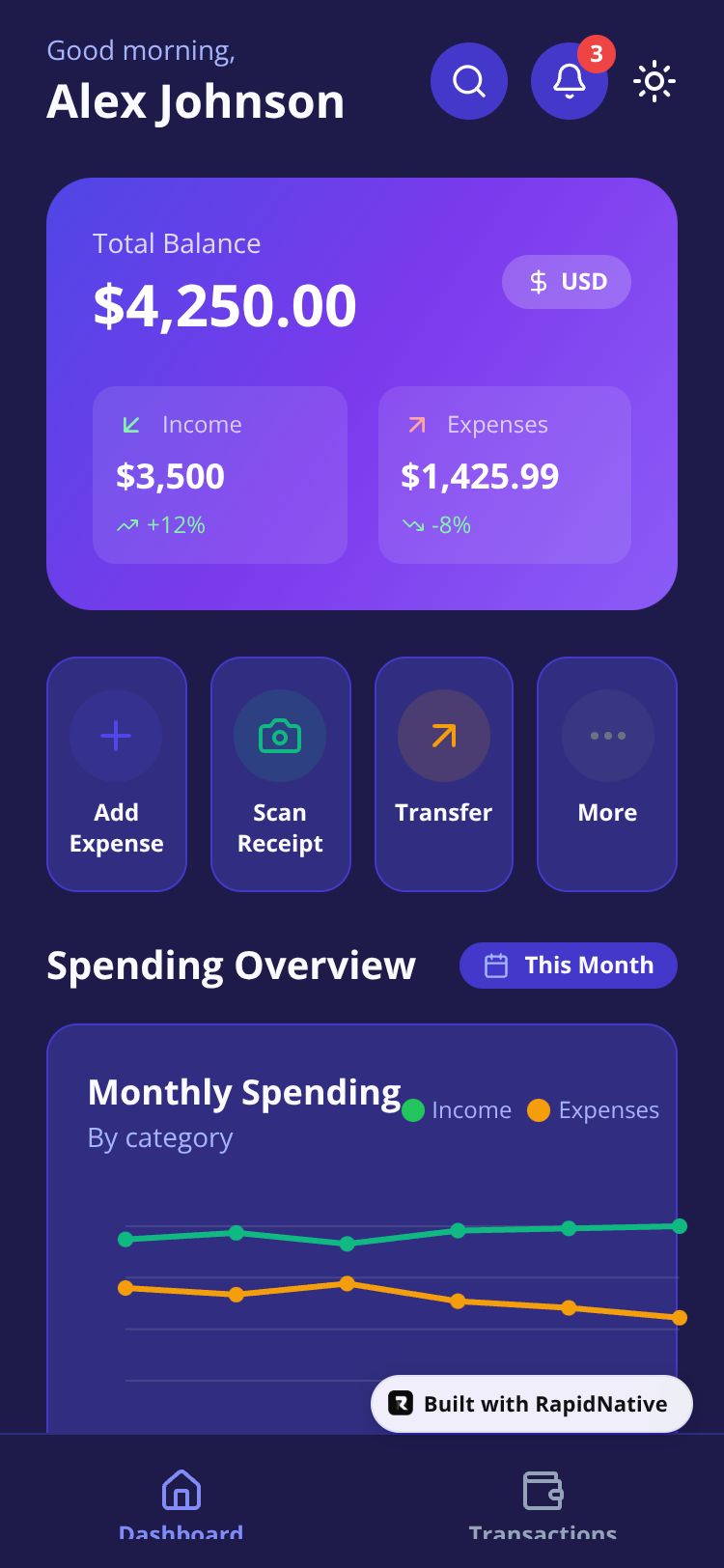 Smart expense tracking app with receipt scanning, budget management, and spending analytics for financial wellness.