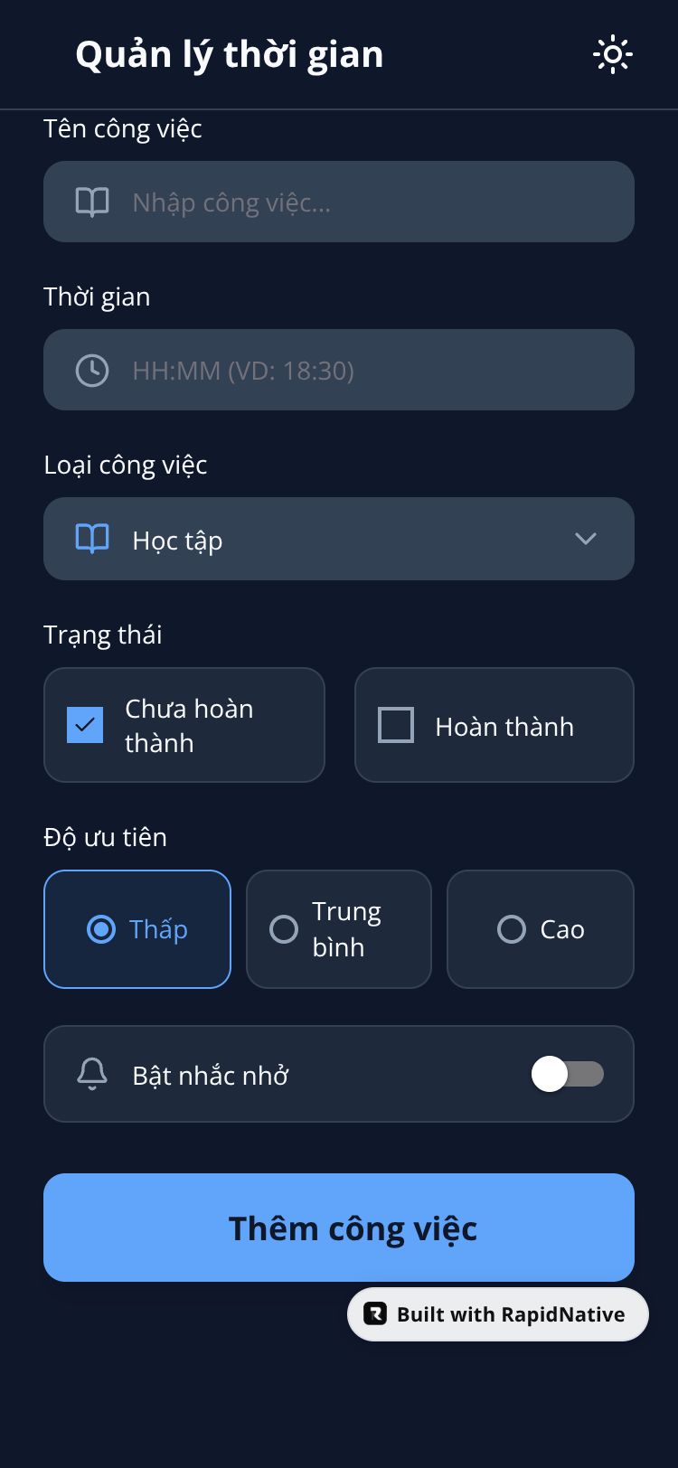 Ứng dụng quản lý thời gian dành cho sinh viên với tính năng theo dõi công việc, nhắc nhở và phân loại ưu tiên.