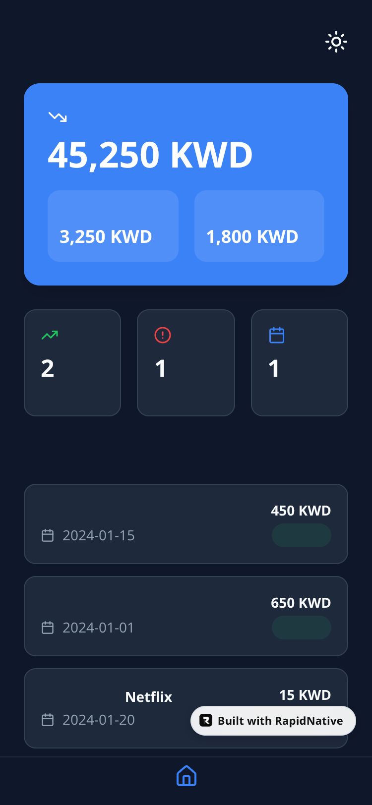 A modern debt management app for tracking personal loans, installments, and monthly obligations in Kuwait.