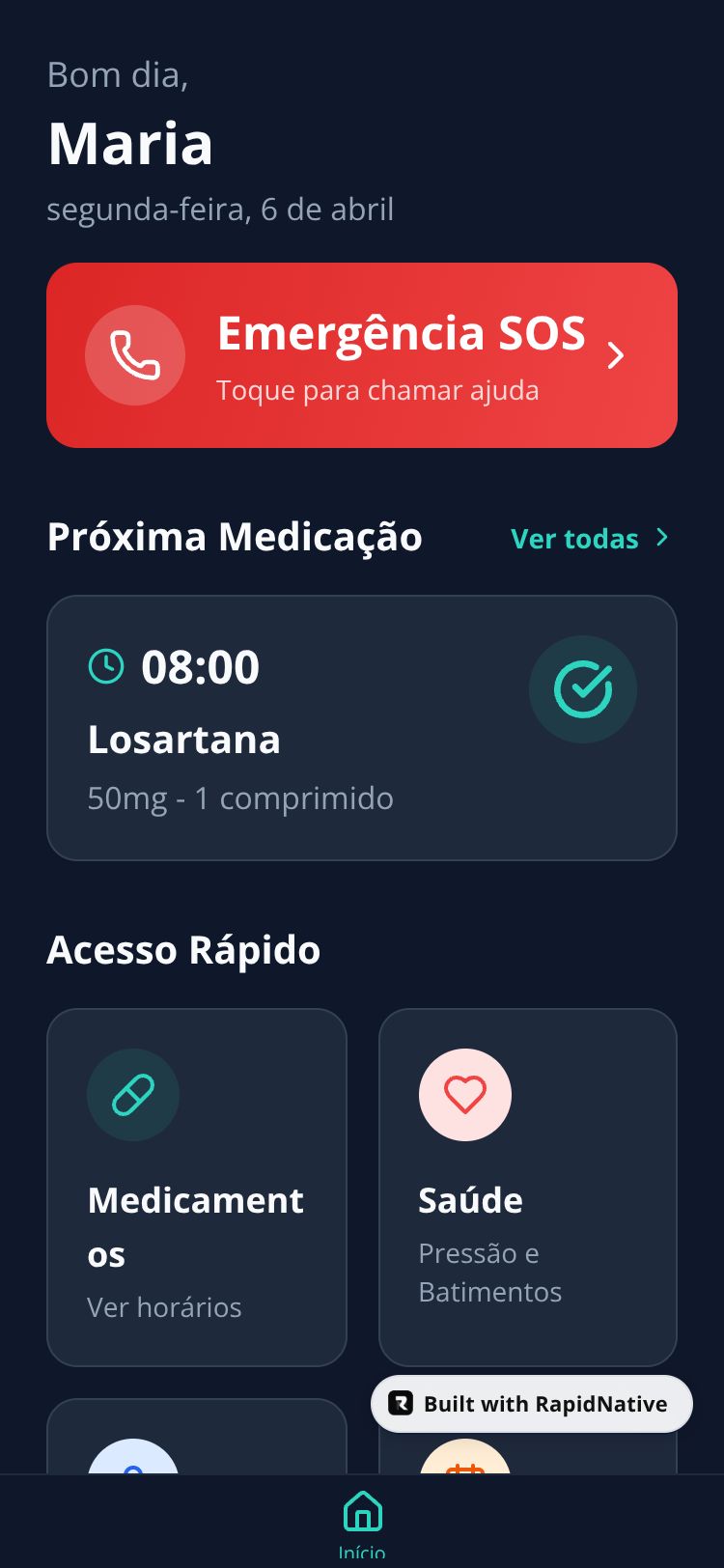 Um aplicativo de acompanhamento para idosos com lembretes de medicamentos, monitoramento de saúde e contatos de emergência.