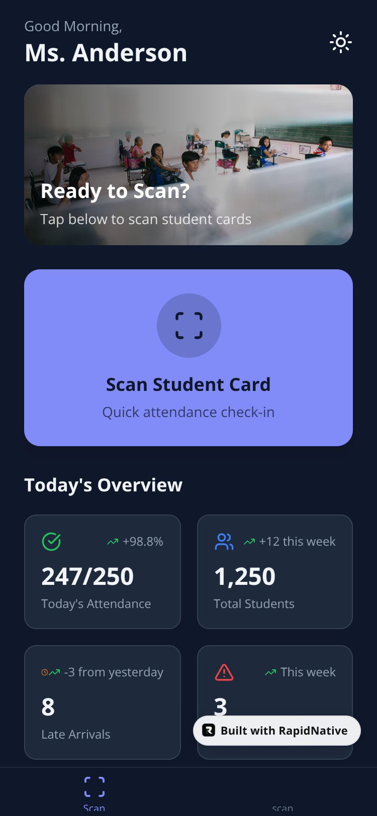 A modern school attendance and discipline management system with card scanning, student records, and behavior tracking.