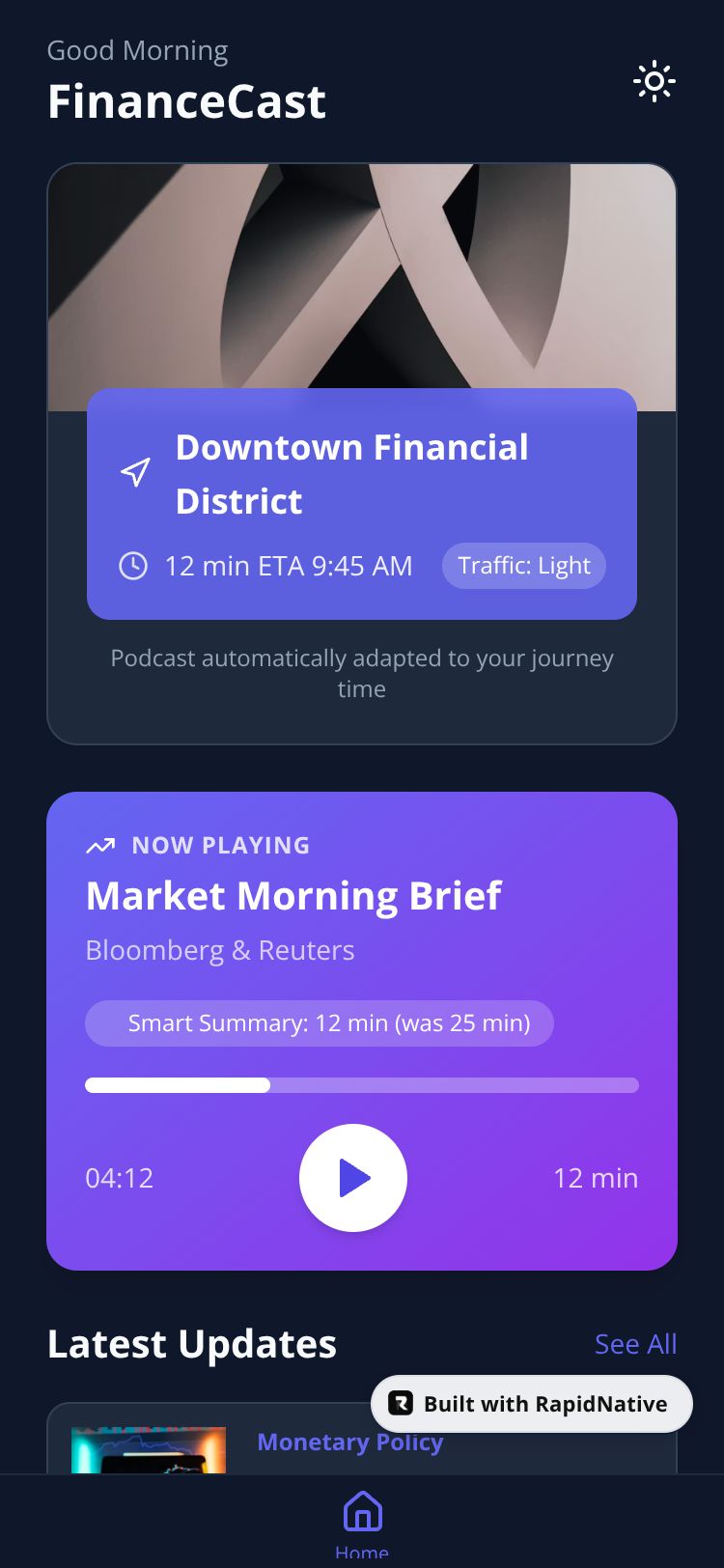 AI-powered financial news podcasts with time-customizable content and location-based insights.