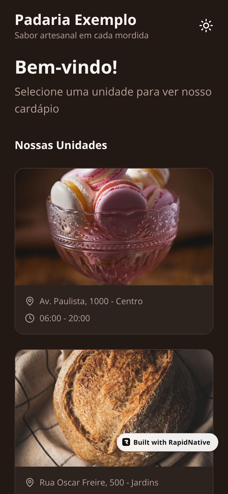 Cardápio digital premium para a Padaria Exemplo com seleção de unidades, pedidos via WhatsApp e informações detalhadas.