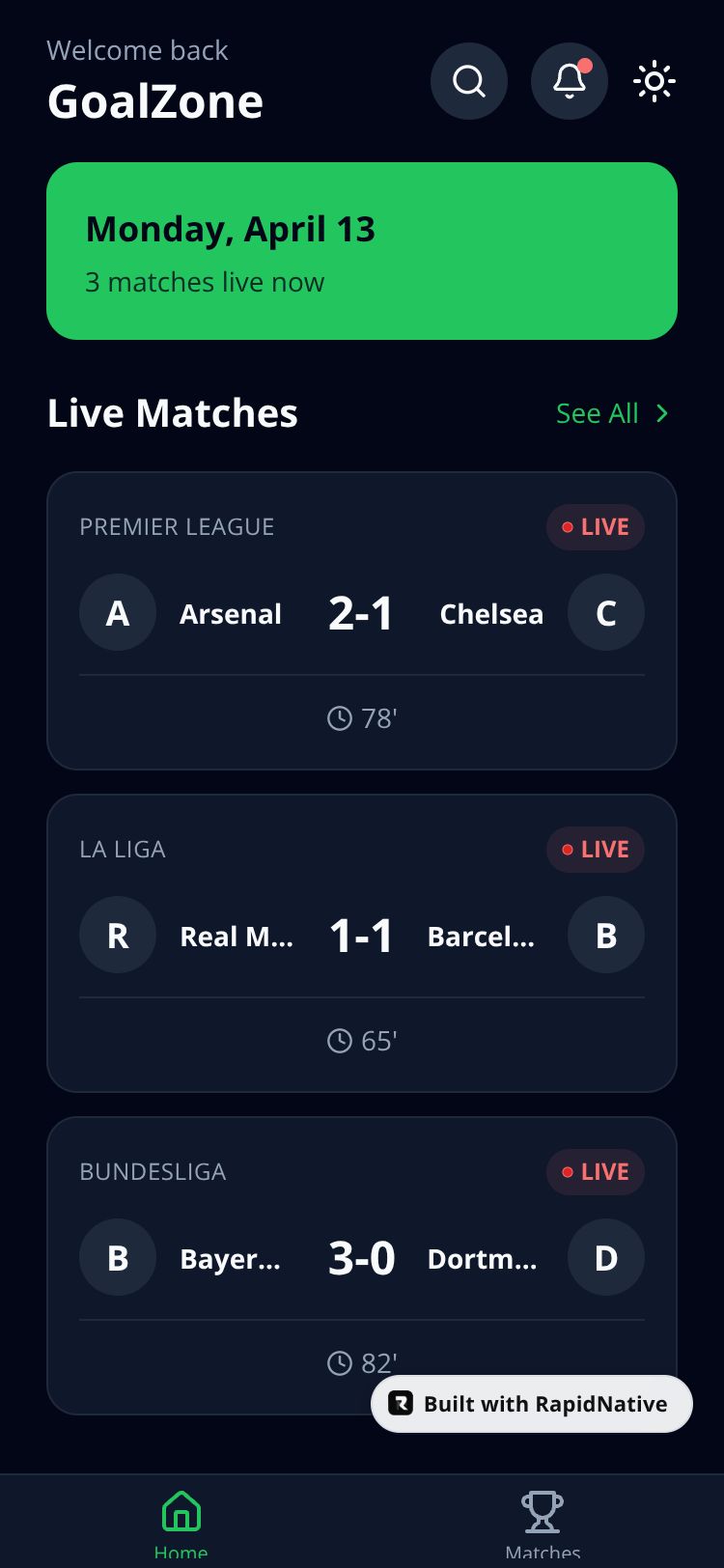 Browse this public project and clone it to start building your own React Native GoalZone app.