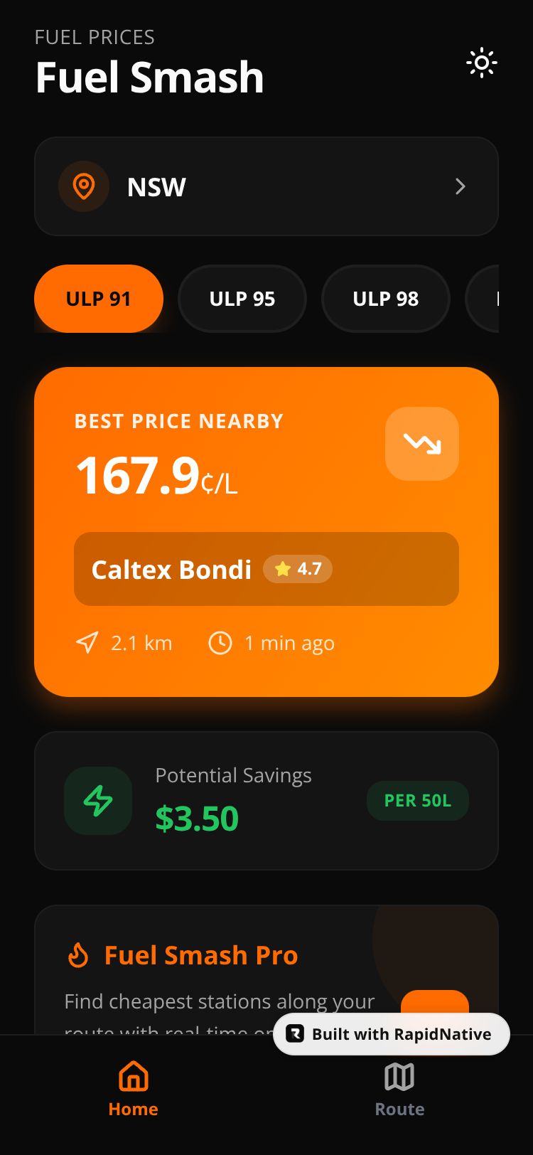 Australia's smartest fuel savings app. Find the cheapest petrol stations near you, plan optimal routes with Pro, and manage fleet fuel costs. Real-time prices for all fuel types across all states.