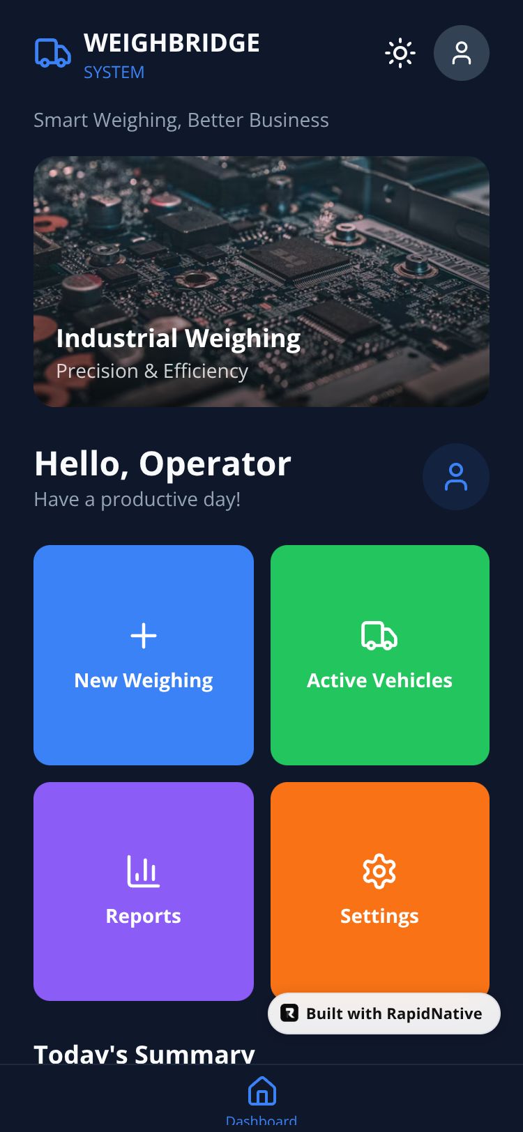 Industrial weighbridge management app for vehicle weighing, ticket generation, and reporting. Features real-time weight capture, vehicle tracking, and operator management.