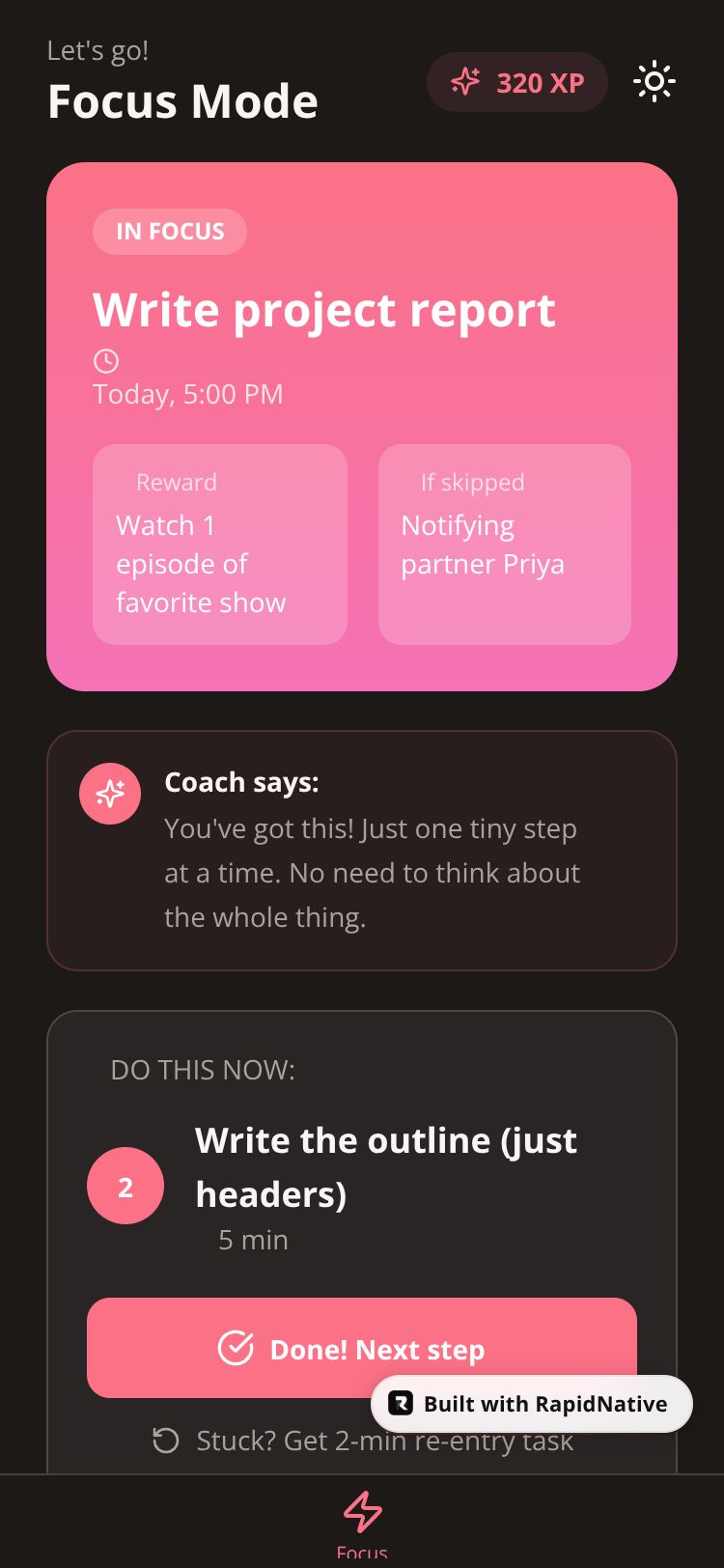 An ADHD-friendly task coach that breaks tasks into tiny steps, provides step-by-step guidance, and celebrates wins with XP rewards.