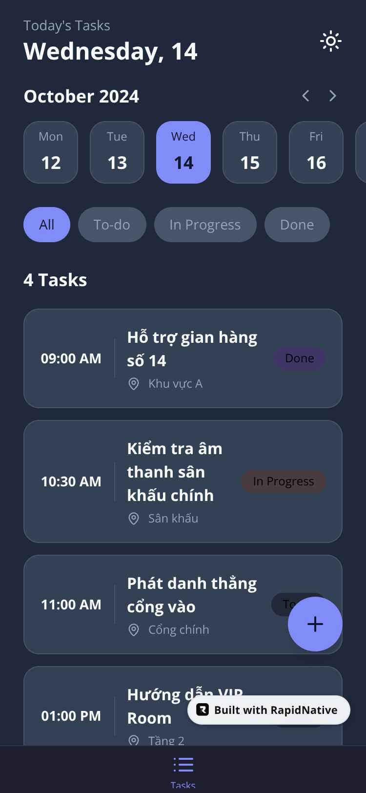 Ứng dụng quản lý nhân sự sự kiện với theo dõi nhiệm vụ thời gian thực và tích hợp bản đồ.