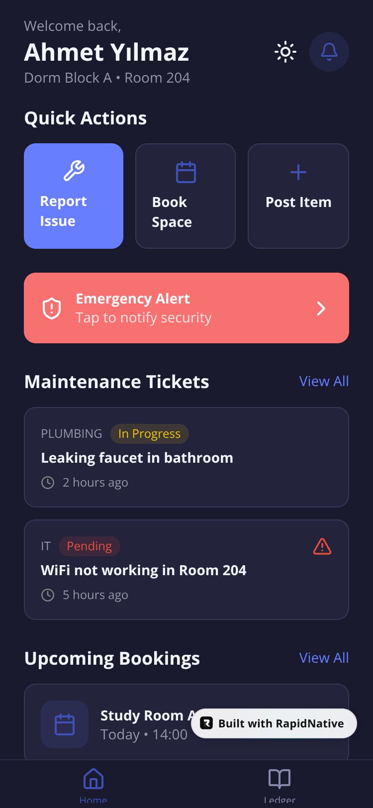 An all-in-one Student Living OS that digitizes university housing with maintenance, expense tracking, marketplace, and facility management.