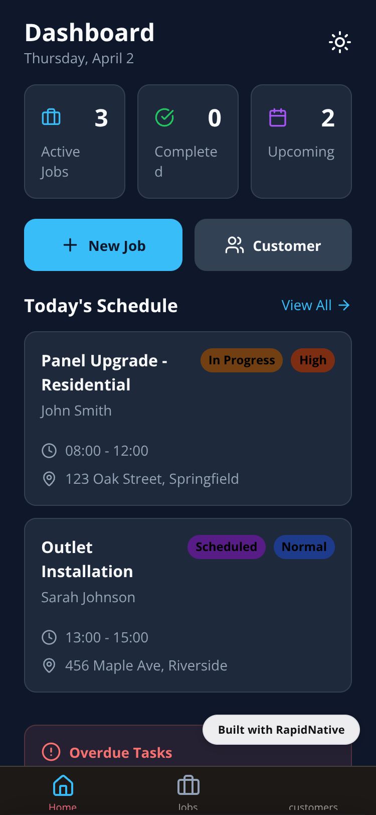 A professional job scheduling and customer management app for electrical contractors. Manage jobs, customers, and daily tasks with ease.