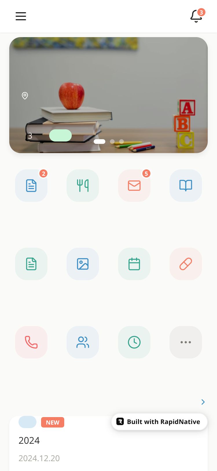 A premium Korean childcare administration app for parents and staff. Features notices, meals, schedules, albums, medicine requests, attendance tracking, and emergency contacts with a warm, trustworthy design.