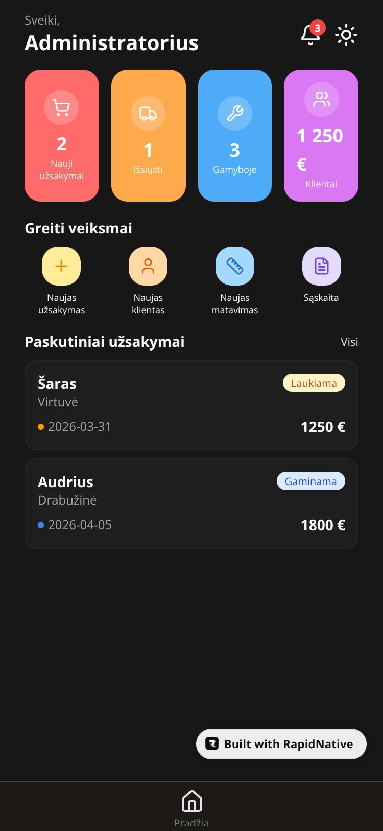 Profesionali baldų gamybos ir užsakymų valdymo aplikacija su projektų sekimu, klientų valdymu ir sąskaitų išrašymu.