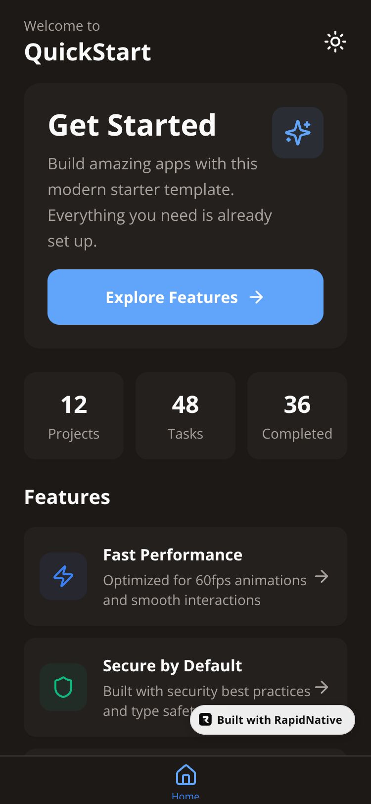 A modern starter template with a clean UI, theme switching, and smooth navigation. Perfect for kickstarting your next React Native project with Expo.