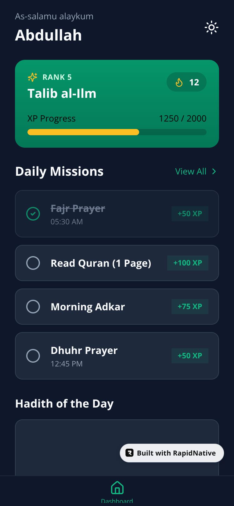 A dignified Islamic daily practice RPG app tracking prayers, Quran, and Adkar with scholarly progression.