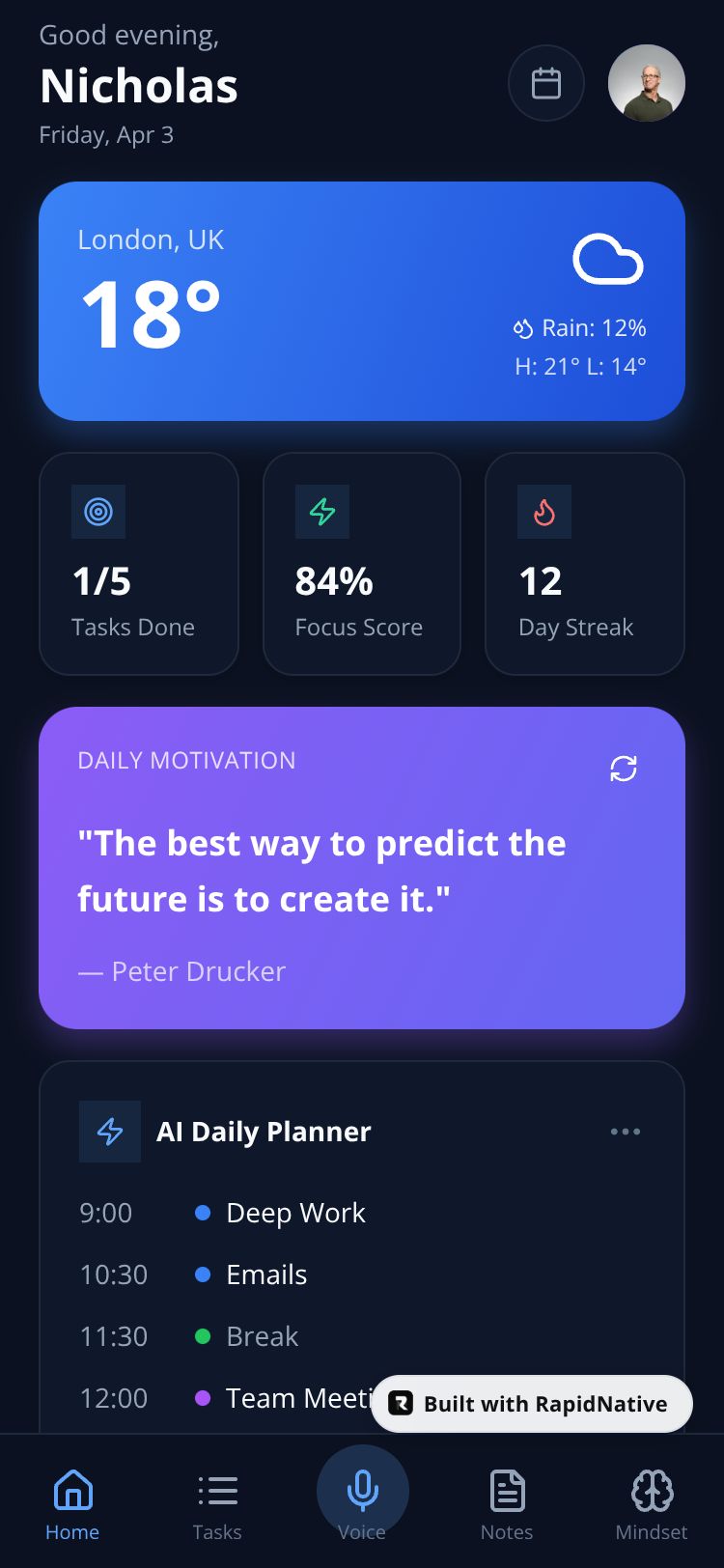 A premium AI-powered productivity app with intelligent task management, voice assistant, AI scheduling, meeting notes, habit learning, and personal AI memory brain.