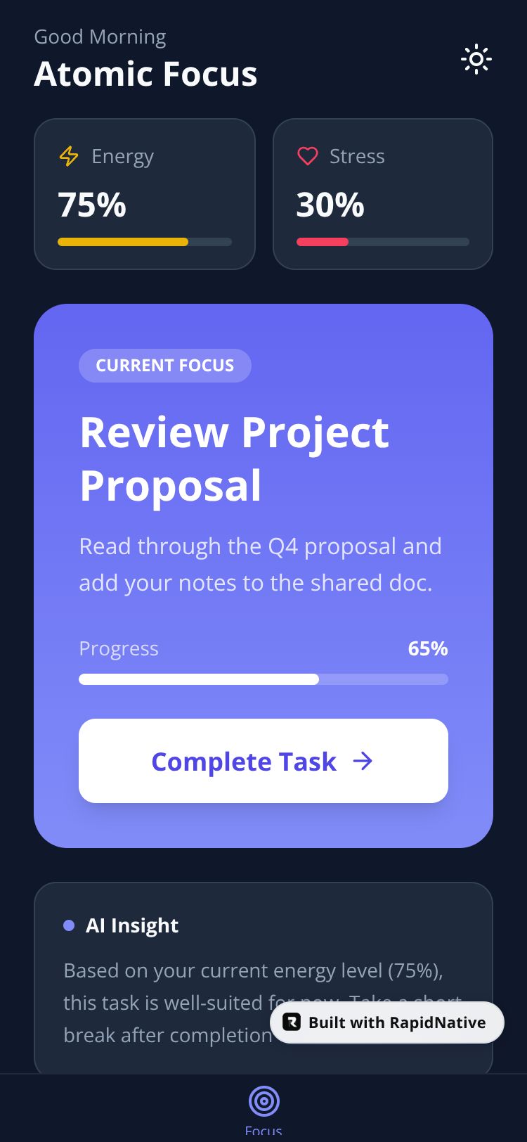 AI-powered focus coach that delivers one task at a time based on your energy and stress levels.