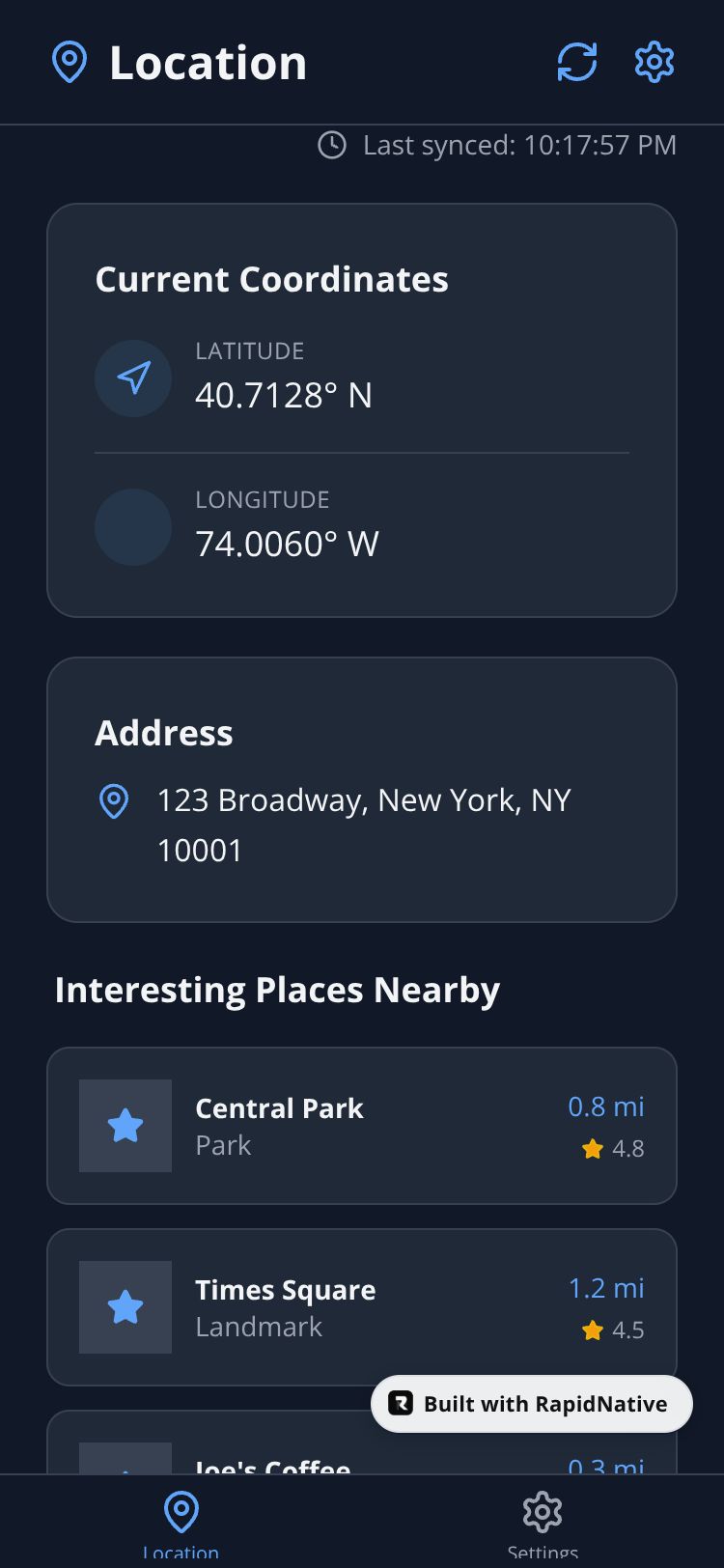 A simple GPS location tracking app that detects user position and displays coordinates, address, and nearby places.