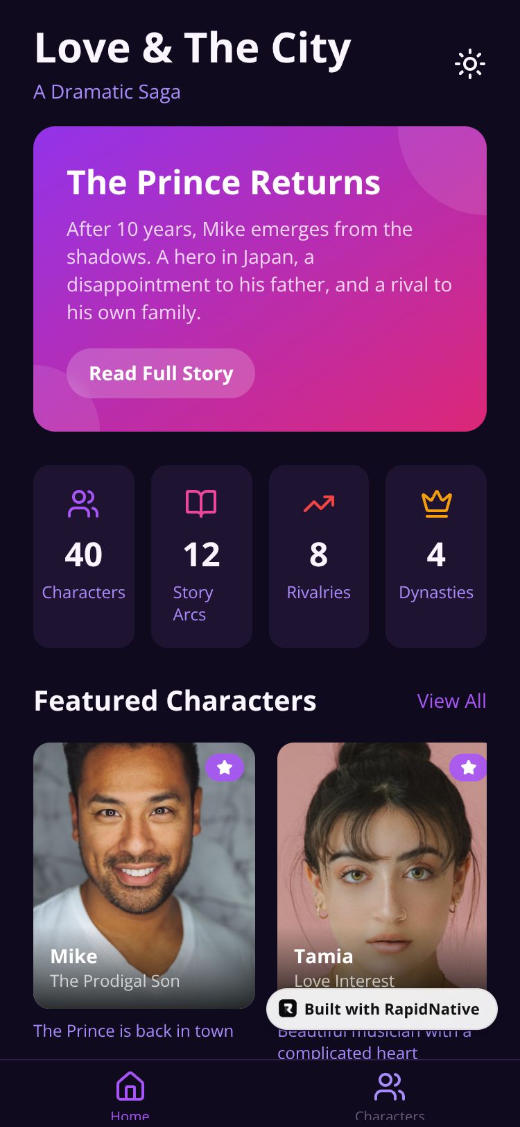 Browse this public project and clone it to start building your own React Native Love and The City app.