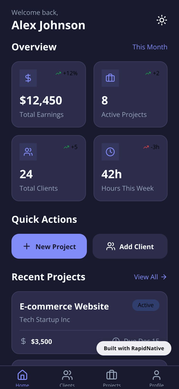 A modern freelancer app for managing clients, tracking projects, and monitoring earnings with a clean and intuitive interface.