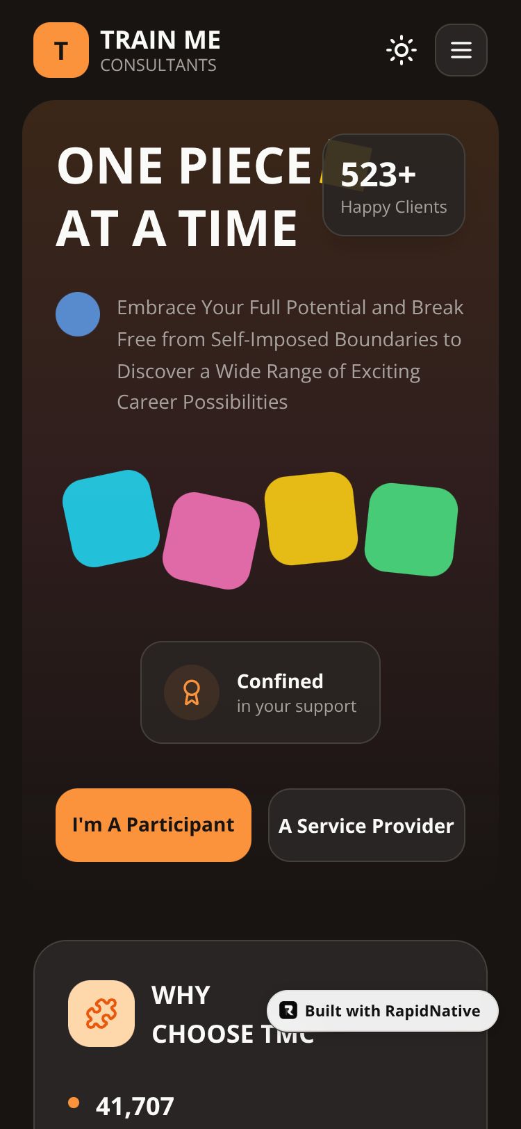 A vibrant NDIS and career support consultancy app helping South Australians discover career possibilities through personalized training and support services.