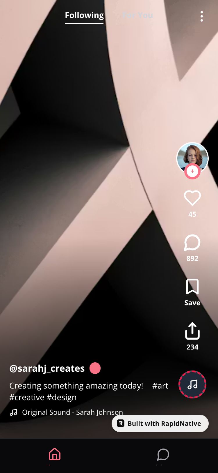 A short-form video social media app with vertical scrolling feed, likes, comments, and creator profiles. Discover trending videos and create your own content.