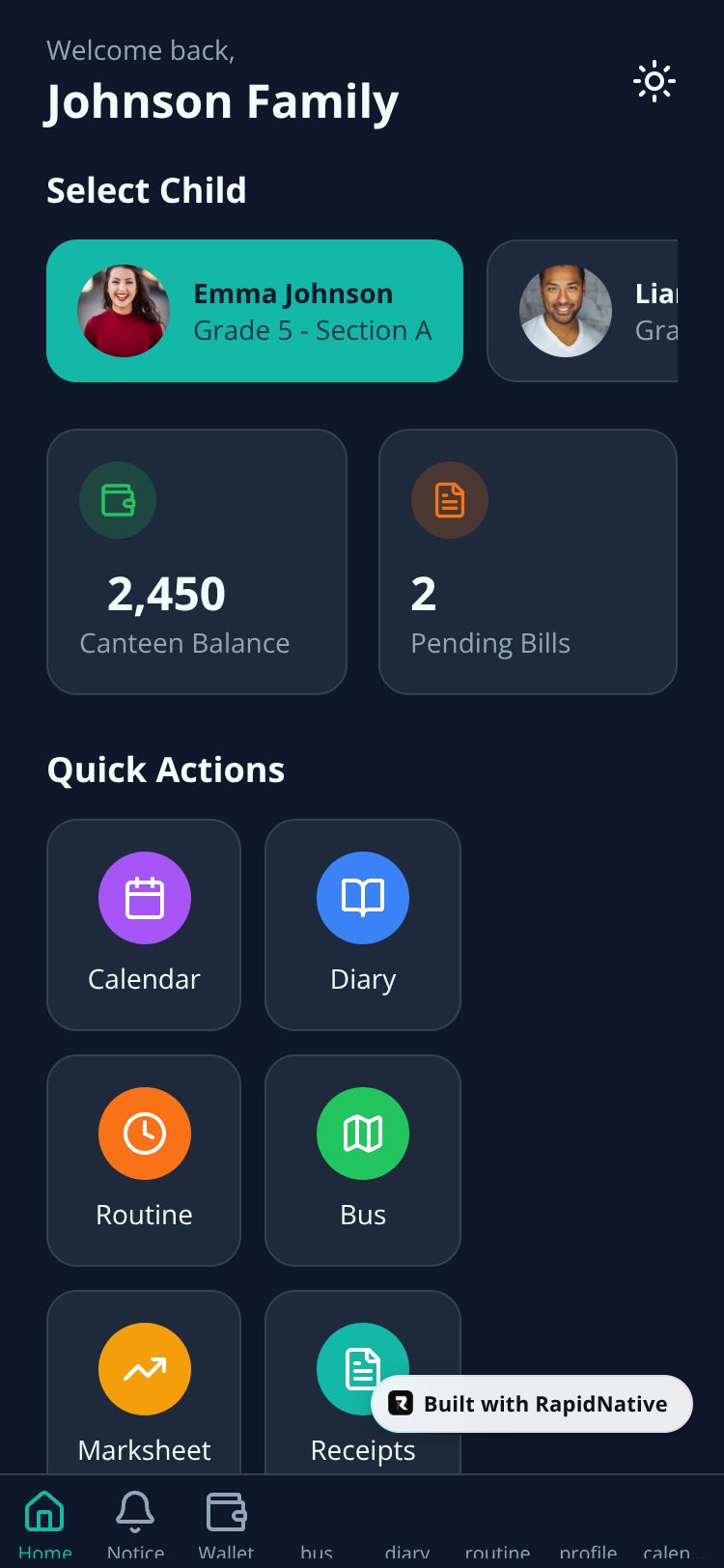 A comprehensive school management app for parents to track notices, homework, fees, and child progress with easy navigation.